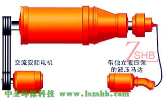 2、采用(yòng)一個交流變(biàn)頻電機+變頻器(qì)驅動(dòng)轉鼓,一個帶獨立液壓泵的液壓馬達(變頻)驅動螺旋,通過調節液壓泵的(de)流(liú)量調整差轉速(sù)。 差轉速可根據推料負載自(zì)動反饋調節。